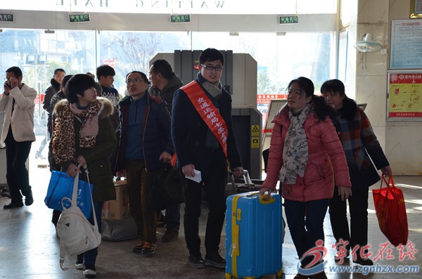 ??? 志愿者們身披紅色綬帶熱情地為乘客提供信息咨詢、換乘指引、協助乘客搬運行李進候車室。一位前去鄉鎮的老婆婆走進車站不知去哪坐車,在志愿者小李的指引下很順利地坐上了回家的班車;見一位大哥手提兩個大行李包,行動吃力,志愿者小鄧更是迅速上前幫助大哥把沉重的行李包搬上車廂放妥,之后他又回到候車廳等候幫助下一位需要幫助的旅客。