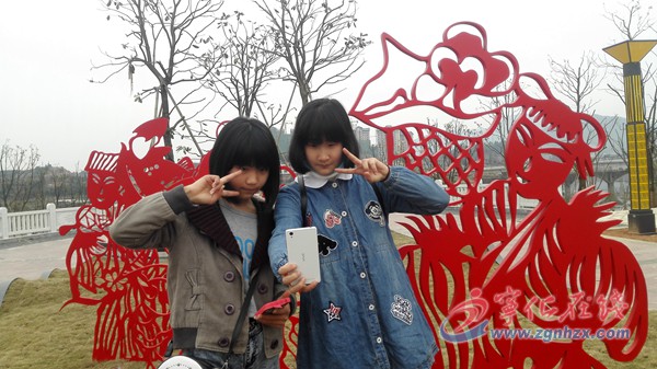 市民在民俗浮雕主題廣場前自拍