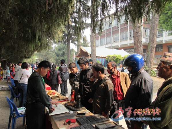 ??? 此次尼泊爾參展,鄒建寧和弟弟兩人一起前往,帶上了兩千多個木活字。參展時間共6天。第一天是準備。第二天是按照組委會給出的命題現場表演雕刻,用兩天時間將 “木材真好”、“世界木材日”、“2016年世界木材日”、“尼泊爾加德滿都”、“國際木文化學會”雕刻成英文、尼泊爾文、中文三種版本。“中英文有雕刻過,容易些,難的是尼泊爾文,之前沒有接觸過而且它的字體結構復雜,雕刻很考驗技術水平。”鄒建寧介紹,后三天就是將雕刻成品印刷成紀念品送給前來觀展的游客。