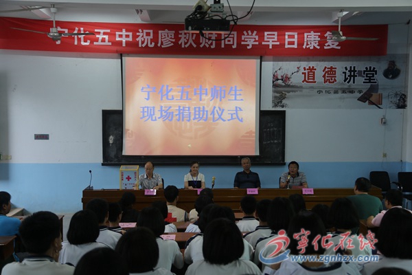 ? ? “這是心的呼喚,這是愛的奉獻,這是人間的春風,這是生命的源泉……”6月16日,在《愛的奉獻》悠揚的旋律中,寧化五中工會、團委聯合舉辦愛心捐款活動,1600余名師生現場為患“結核病變”的廖秋財同學捐款30649.20元。縣關工委主任羅朝祥及縣紅十字會相關負責人參加捐款活動。