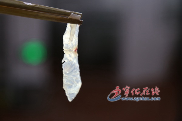 魚(yú)片上還有魚(yú)骨。用刀薄薄地橫切,便可將魚(yú)骨去除。另一面也要薄薄地切掉紅色的部分。鐘成富認(rèn)為,紅色的這部分腥氣重。
