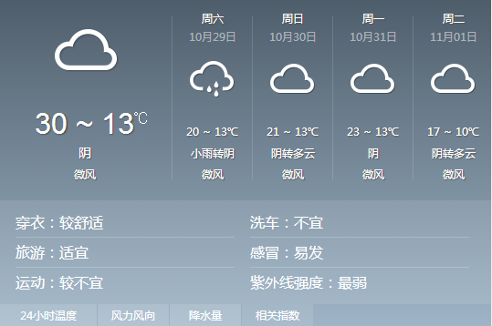 逐日天氣預報:10月29日:陰到多云,有小雨,氣溫13-20℃;10月30日~11月2日:陰到多云天氣為主,氣溫13-21℃;10月31日:陰到多云天氣為主,氣溫13-23℃;11月1日:陰到多云天氣為主,氣溫13-17℃;11月2日:陰到多云天氣為主,氣溫10-19℃;11月3~4日:以多云天氣為主,氣溫8-20℃;11月3~4日:以多云天氣為主,氣溫8-22℃。(羅 鳴 羅鳳蘭)