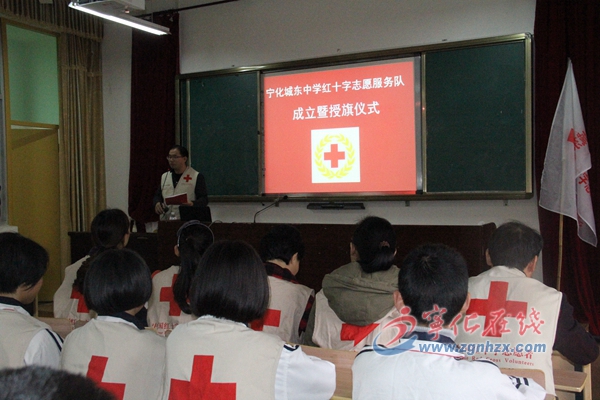 ??? 儀式上,寧化紅十字志愿者黃珺詳細介紹了紅十字運動起源及寧化紅十字會近幾年來在助學扶貧、履行“三救三獻”職能等方面所做的工作,讓同學和老師們對紅十字精神和職能有了更多的了解;縣紅十字會工作人員宣讀《寧化縣紅十字會關于成立寧化城東中學紅十字志愿服務隊的通知》,希望志愿隊弘揚“人道、博愛、奉獻”的紅十字精神,廣泛開展紅十字青少年活動;寧化紅十字志愿服務大隊秘書長夏世威為志愿服務隊授旗,并表示熱烈的祝賀;志愿服務隊榮譽隊長洪麗琳接受隊旗,全體師生志愿者面對隊旗進行宣誓;縣紅十字會為城東中學頒發團體會員單位牌匾。