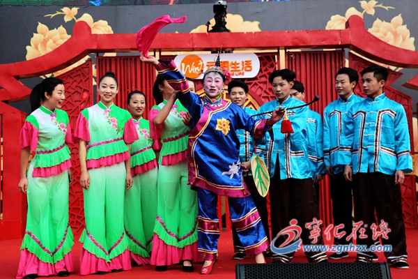 客家媒婆帶著一群姑娘小伙歡跳著上了舞臺。
