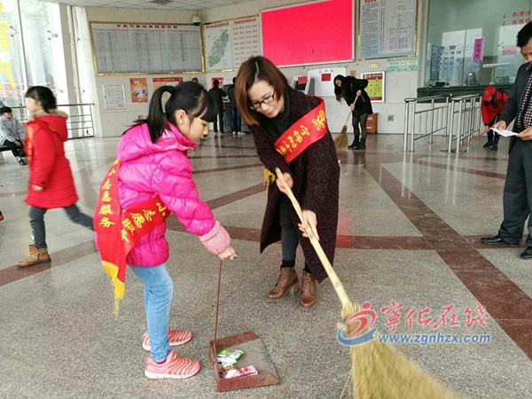 ??? 頭戴“寧師附小志愿服務”小紅帽或身披“寧師附小志愿服務”紅綬帶的師生,在人群中顯得格外醒目,他們有的在維持秩序,有的在指導旅客自助購票,有的在幫助旅客拎行李,抱小孩,攙扶老人,有的在打掃車站內外的衛生,還有的在給旅客遞送姜茶,一個上午,志愿者們就送出了300多杯熱氣騰騰的姜茶。微笑服務的志愿者穿行在廣場上、售票處、候車室里,為來來往往的旅客送上了一份貼心的溫暖,讓車站內外處處洋溢著濃濃的暖意。