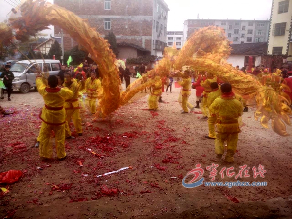 ? ? 當天,村民早早就自發聚在一起,將供奉在廟里的神像抬出來點上香火準備巡游。上午9時許,巡游正式開始,巡游的隊伍由舞龍隊、八仙戲班隊、劃旱船、少兒舞蹈隊、鐵桿故事等十幾個方隊組成,踩街隊伍沿著村莊小巷邊走邊演,所到之處,沿路的村民都會點上早早備好的蠟燭、鞭炮和香迎接游行的隊伍,大家以這種特有方式祈求來年風調雨順,五谷豐登,合家安健。
