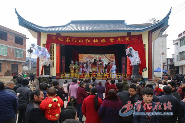 群眾在半溪村新戲臺前觀看石門山紅袖添香劇團表演的《天官賜福》