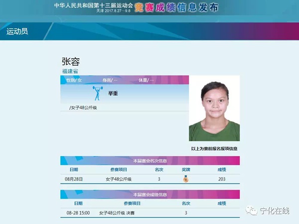 寧化籍小將張容奪舉重女子48公斤級銅牌