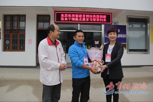 ? ? 11月30日,福建省首位成功向美國患者捐獻造血干細胞志愿者馬智榮,在三明市紅十字常務副會長劉歲美一行的陪同下,回到寧化。