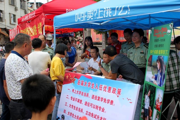 ? ? 為了進一步營造廣大適齡青年參軍入伍的熱情,6月8日下午,高考考試一結束,寧化縣人民武裝抓住高考期間適齡學子聚集的契機,在各個高考點外,開展精準征兵宣傳活動。