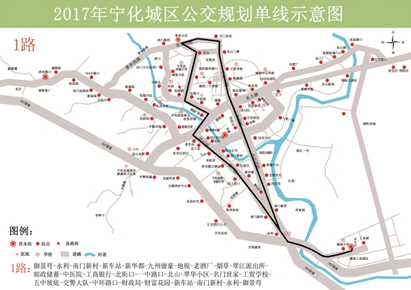 1路:御景灣-永利-南門新村-新車站-新華都-九州駿豪-地稅-老酒廠-煙草-翠江派出所-郵政儲蓄-中醫院-工商銀行-北街口-一中路口-北山-翠華小區-名門世家-工貿學校-五中坡底-交警大隊-中環路口-財政局-財富花園-新車站-南門新村-永利-御景灣