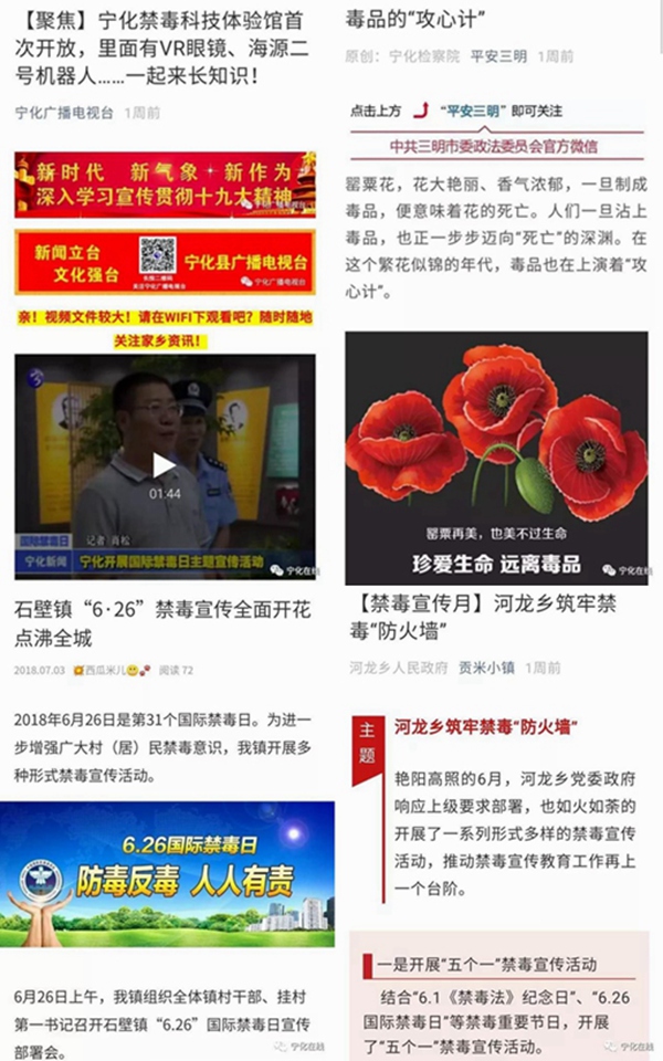 禁毒宣傳月期間全縣各鄉鎮、單位共制作禁毒美篇、微信宣傳稿20余篇。通過接受禁毒教育、觀看緝毒電影、組織志愿活動、利用圩日、黨員奉獻日等方式開展禁毒宣傳,通過“寧化公安”微信公眾號、“翠城警視”“寧化電視臺”等電視欄目播放禁毒宣傳活動內容,擴大宣傳面,豐富宣傳載體,深化宣傳內容。