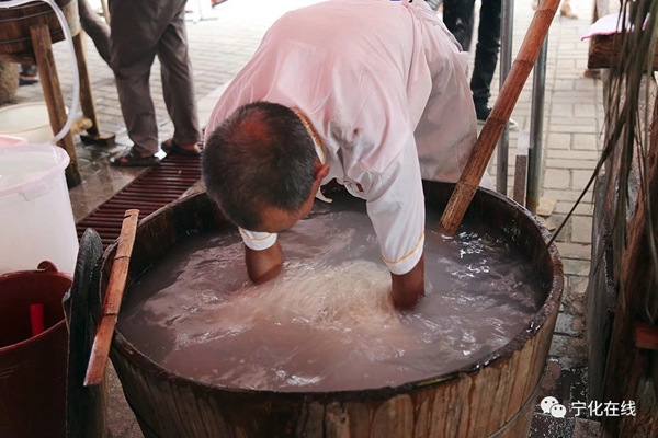 撈出的粉干放置到一旁竹架上晾干