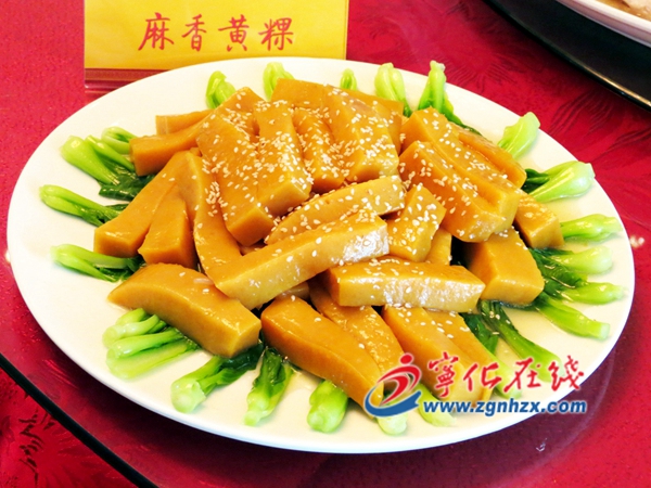 ? ? 捶打黃粿,蘸糖現(xiàn)吃。更多的是另一種吃法,即把現(xiàn)成的大塊黃粿切成小條塊,放入沸水翻滾的鍋里煮上幾分鐘后,撈起放在盤子內(nèi),再用豬肝或豬肉等臘味油(也可放熟茶油)拌上,加上些許蔥、蒜等調(diào)味佐料,就是一盤色香味齊全的黃粿條。