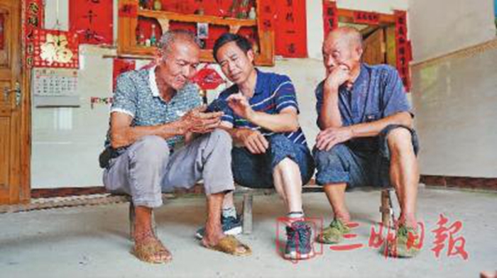 曾繁益的兒子曾祥玉(右一)、女婿謝序鰲(左一)正在瀏覽手機(jī)里的“記者再走長征路”報道。