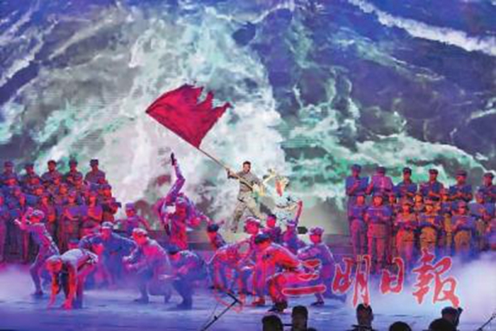 “白云山頭云欲立,白云山下呼聲急……七百里驅(qū)十五日,贛水蒼茫閩山碧。橫掃千軍如卷席……”大幕拉開,舞臺(tái)暗光中,毛澤東氣勢(shì)磅礴的詩(shī)詞,仿佛把人帶到了硝煙彌漫的戰(zhàn)爭(zhēng)歲月,讓人看到了紅軍戰(zhàn)士英勇拼殺的畫面!