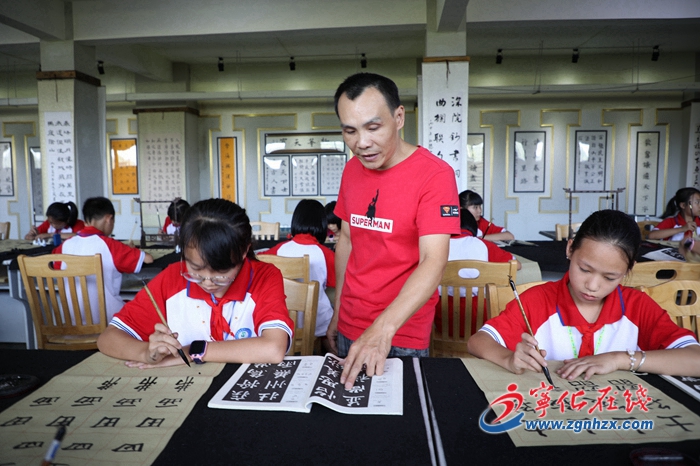 圖為在安遠鎮中心學校,書法教師指導學生。(賴全平攝)