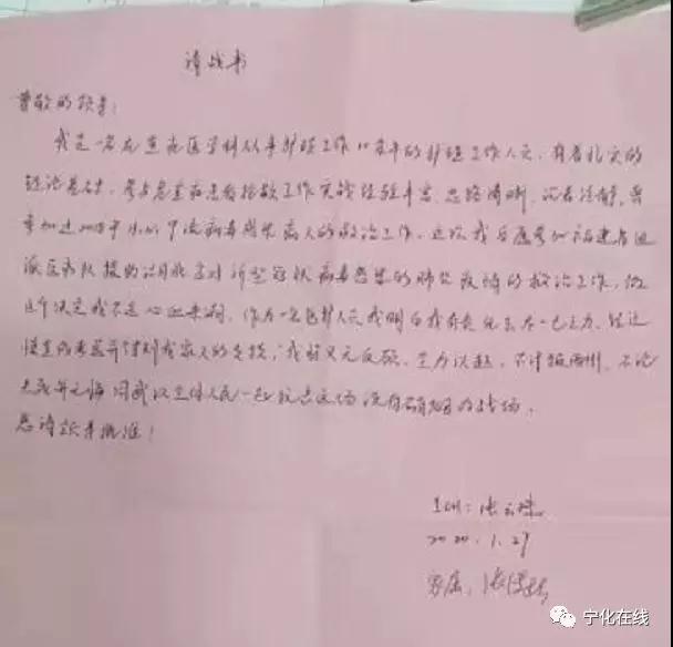 武漢發生新型冠狀病毒感染的肺炎疫情以來,牽動著寧化廣大醫務人員的心。1月27日,寧化縣總醫院重癥監護室的護士張云珠第一個向縣總醫院遞交了請戰書,報名參加省派醫療隊,援助武漢人民打贏疫情防控阻擊戰。