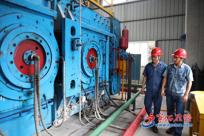 陽(yáng)貴華(左)檢查機(jī)器運(yùn)轉(zhuǎn)情況