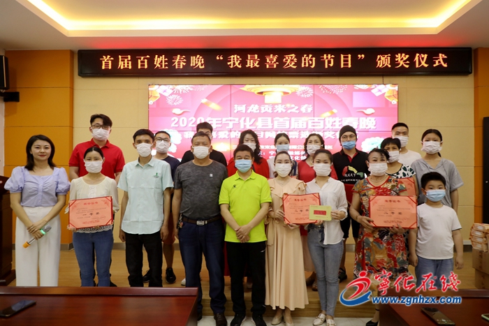春晚節目中,共有10個節目深受廣大觀眾的好評,被評為2020年寧化縣百姓春晚“我最喜愛的節目”。其中,女聲獨唱《多想對你說》、古箏合奏《我和我的祖國》、男聲獨唱《新的天地》等3個節目獲得一等獎。此次頒獎儀式從簡,縣融媒體中心負責人、三明河龍貢米米業股份有限公司相關負責人為獲獎節目代表頒發了證書和獎金。