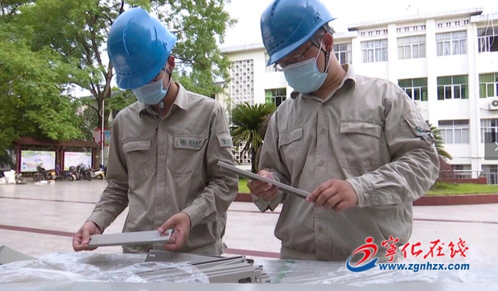 6月28日,在寧化六中,寧化縣供電公司工作人員正在忙碌施工,以便新安裝的空調(diào)能正常運(yùn)轉(zhuǎn)。