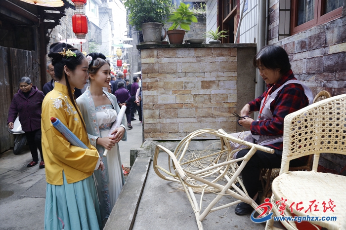 原來,這里正舉行“千年古縣,萬人古巷”活動,游客不僅可以親手體驗打鐵、藤椅編織等傳統技藝,還能品嘗地道的擂茶、松丸子等客家美食。
