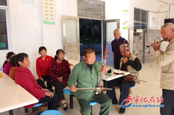 這是一個由老人們自發(fā)組成的合唱團,取名寧韻合唱團,他們正在演唱當?shù)乜图疑礁琛C恐芏衔?時,合唱團成員和部分村民準時來到幸福院,跟隨著節(jié)奏,演唱一曲曲紅歌、山歌。