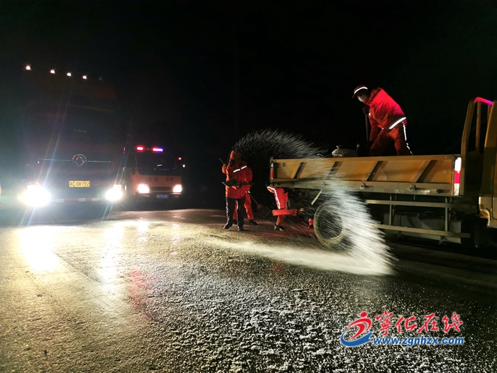 一到現場,工作人員首先擺放警告警示標志,請求公安部門臨時管控交通。隨后,10名站班工人分兩撥借助車燈依次排開,從埡口至坡底作業,沿長下坡撒布融雪劑。至9日3時20分,1.7公里的結冰路段撒布融雪劑約2噸,一度受堵的道路恢復通行。