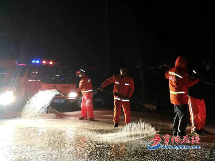 “國道G356線淮土寒谷村段道路濕滑結冰,有大車側翻,請求派員融冰除險。”1月8日23時50分,寧化公路養護分中心接110指揮中心報警電話。