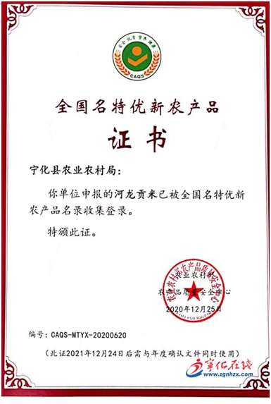 寧化縣農業農村局根據《全國名特優新農產品名錄收集登錄規范》要求,申請對“河龍貢米”實施全國名特優新農產品名錄收集登錄,通過省級初審、農業農村部專家評審和公示,符合全國名特優新農產品名錄收集登錄程序和條件,獲得全國名特優新農產品證書,證書編號為:CAQS-MTYX-20200620。(通訊員 邱星菊)