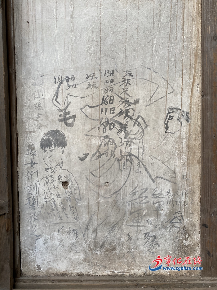 該舊址正在修繕保護,原來堆滿雜物的左右?guī)壳謇砀蓛艉螅?幅標語漫畫也浮現(xiàn)出來。這幾幅紅軍標語表現(xiàn)形式獨特,圖文并茂,內容也結合了當?shù)貙嶋H。如一幅漫畫標語:一頭水牛在水邊吃草,不遠處一條小船,文字寫著:“打倒蔣介死(石);擁護共產(chǎn)黨;為紅……”還有一幅漫畫標語:一個大大的空心字“家”,“家”的右邊畫著一男子和一小孩,左邊畫著一女子,剪了短發(fā),旁邊寫著:“婦女們割髻放足;男女平等;擁護共產(chǎn)黨……”