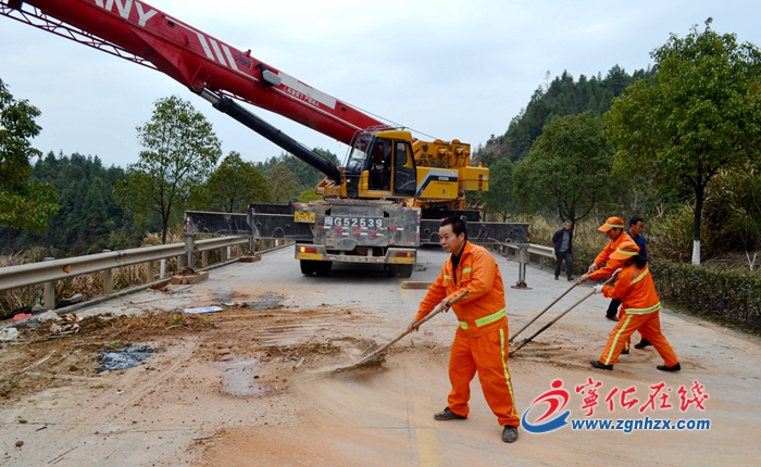 當天下午14時10分許,在起重吊車到達現場之后,寧化公路中心路產工作人員和肩頭嶺班站工人立即在道路兩側按規范擺放警示標志,并安排人員協助維持交通秩序,方便吊車作業。在起吊作業完成后,養路工人又緊急投入到路面清理當中,經過近70分鐘的緊張作業,該路段恢復了暢通。