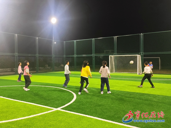夜幕剛剛降臨,方田中心學校旁的足球場變得熱鬧起來,幾盞大功率電燈發出明亮的光芒,吃過晚飯的村民們陸續來到這里,在場上踢起了足球。開球、護球、傳球、射門……一個個踢得那么認真。場外,小朋友們歡呼雀躍,老人們鼓掌加油,氣氛歡快、熱烈。