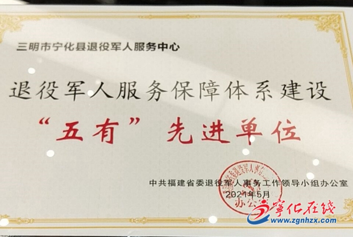 近日,福建省委退役軍人事務工作領導小組辦公室通報表揚了全省100個縣、鄉級“五有”先進單位以及10名工作人員。寧化縣退役軍人服務中心、城郊鎮退役軍人服務站榜上有名,被評為“五有”先進單位。