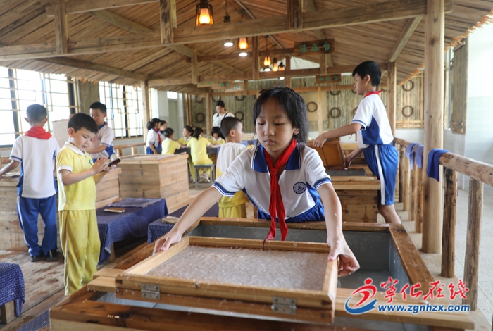 學生們在體驗館了解了玉扣紙制作流程中的砍料、浸塘、剝青、踏竹麻、做紙、焙紙、拔紙、裁紙等20余道制作工序,在老師的指導下,對其中的一些步驟進行操作體驗。在造紙工序中,撈紙漿算是核心環節,只見孩子們紛紛將木格抄紙簾放進紙槽,往槽里蕩漿搖浪,待漿浪卷過簾面,便提起來,讓簾子濾去水,再拿起木格中的竹簾,倒扣在一塊花布上,用毛刷去水,花布上就會留下一層薄薄的紙漿。孩子們轉身將帶有紙漿的花布放在木板上,晾干后便能揭下花布上的紙張了。孩子們拿著工具,興致勃勃地跟著老師學習起了攪紙漿、撈紙漿、濾紙胚、晾濕紙等重點工序。經過晾曬,美麗的手工紙就完成了。孩子們都爭著要跟自己的作品合影留念,神情中都充滿了自豪與喜悅。