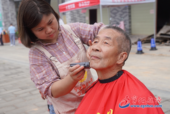 活動現場,一邊是火熱的包粽子比賽,另一邊則是9名紅十字會公益理發師手握理發工具,為前來的小區老人修理發型。