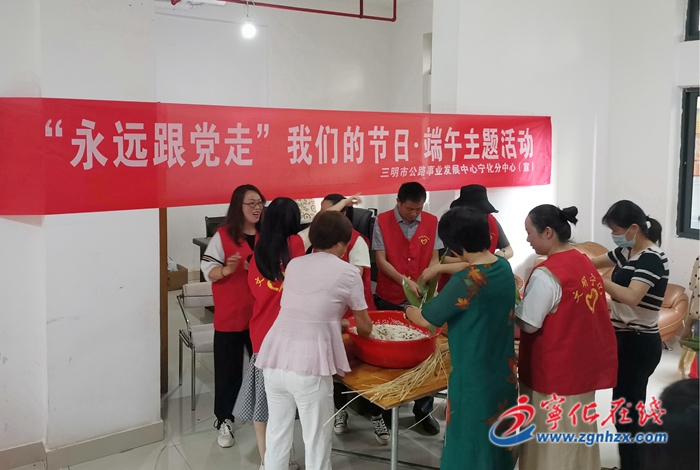6月10日,寧化公路分中心聯合翠江鎮雙虹社區等單位在金茂城市廣場開展以“永遠跟黨走”為主題的端午包粽子活動。