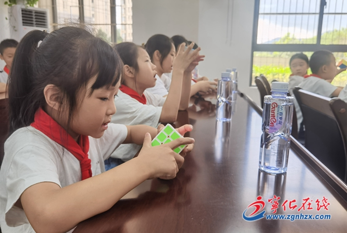 當天上午,在寧化一中連岡分校教師的指導下,25名小學生拿著五顏六色的魔方,快速地旋轉起來。魔方游戲是鍛煉思維的益智游戲,能讓學生們在娛樂中進一步認識空間立方體的組成和結構,感受到數學的樂趣與魅力。