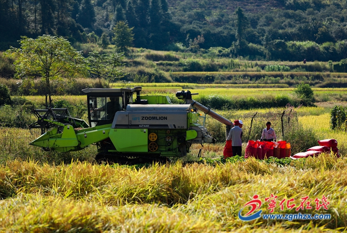 稻田里,收割機機聲隆隆,村民揮汗如雨,一壟壟金黃的稻谷收入收割機,收割景象熱鬧非凡,一幅春華秋實的豐收圖景已然徐徐展開。