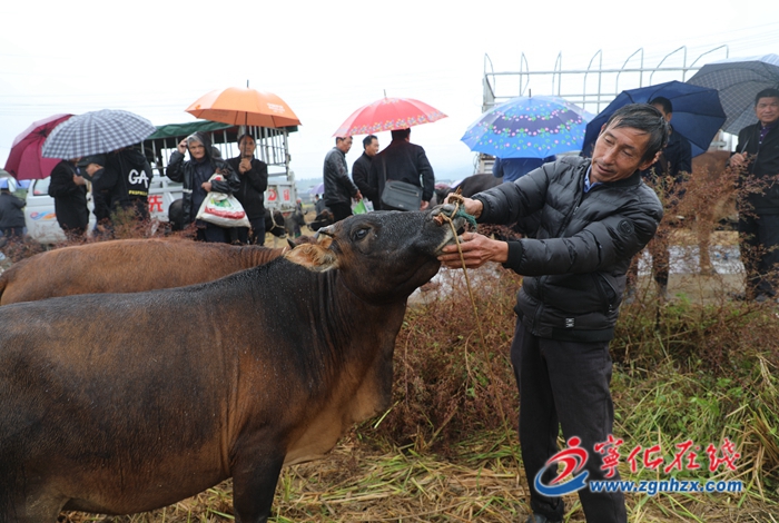 每年農歷九月二十七,中沙鄉中沙村都會舉辦牛市,多的時候有近千頭牛參與交易。當天上午,盡管天公不作美,雨下個不停,中沙村牛市仍舊火爆,來自四鄰八鄉的牛販和農民云集于此,紛紛推銷或挑選自己中意的耕牛,或為來年的春耕生產做準備,或將牛市的耕牛販往各地銷售,或將肉牛販往肉類市場。牛市上,人們買牛、賣牛、相牛、探牛,有經驗的買牛人會觀察牛的體形和毛色,判斷牛的健壯程度;有的還會掰開牛嘴數牙,以斷定牛的歲數。還有耕牛買賣方面的行家穿梭其間,充當起中間人角色,好不熱鬧。