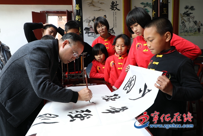 捐贈儀式后,俞坊村俞家棍傳習所20多名孩子現場表演俞家棍、五祖拳及樸刀、關公刀、射箭等技藝,習練書法,并與來賓合影留念。縣書法協會相關人員現場開展書法教學,指導孩子們練習書法,并題字留念。