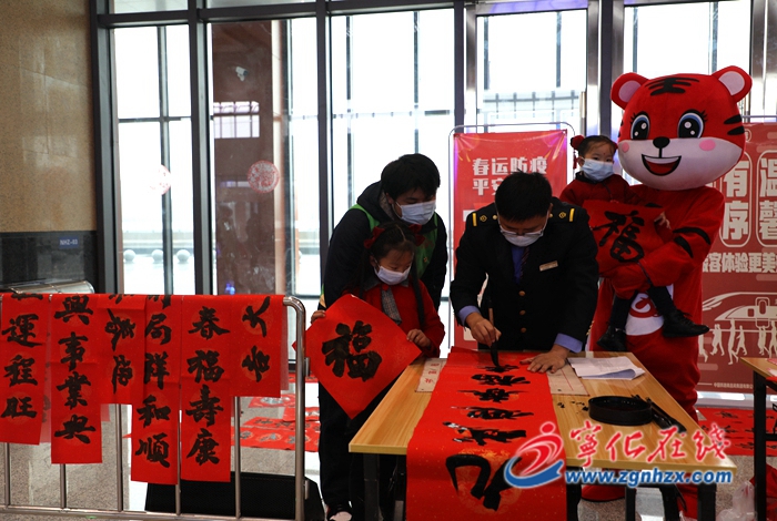 在候車廳內,旅客人數(shù)雖比平時多,但井然有序,并不擁擠。當天上午,寧化鐵辦工作人員、鐵路職工揮動著手中的小紅旗,與旅客們齊唱《國家》《回家》《藍蓮花》等歌曲,并進行樂器表演。寧化縣書法協(xié)會工作人員、鐵路職工現(xiàn)場揮毫潑墨,向旅客書贈春聯(lián)、送“福”字,送上新春的問候與祝福。