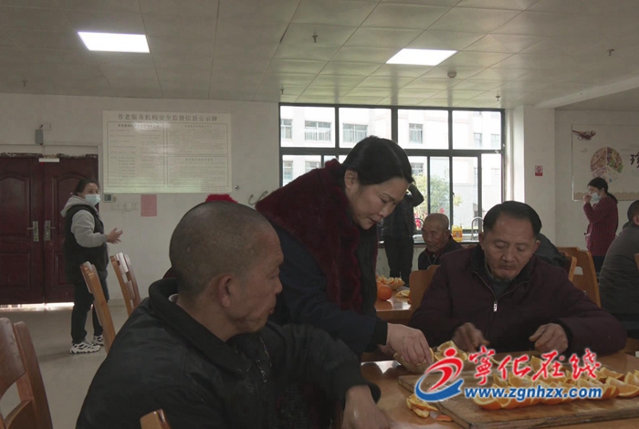 代表們與工作人員在食堂將臍橙切好邀請老人共品臍橙。