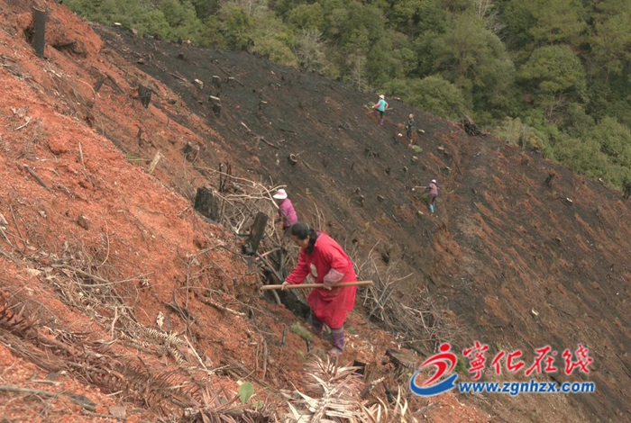 近日,在城郊鎮九柏嵊村南畬214畝山場上,林農們揮舞著手中的鋤頭,挖坑、培土、踩實,栽種杉樹苗。