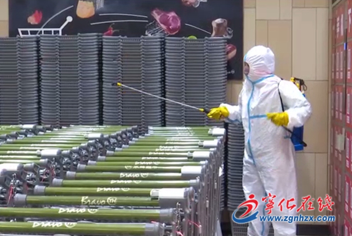 在寧化縣永輝超市萬星廣場店,每日清晨工作人員都會將超市出入口、收銀臺、購物車等設施和賣場區域進行地毯式消殺后迎接市民的到來。永輝萬星廣場店作為寧化城區大儲備量的連鎖超市,目前米、面、油等生活必需品供應充足。