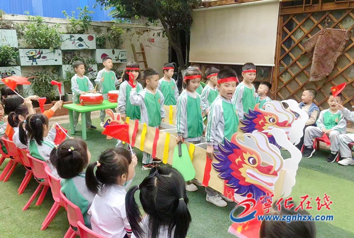 6月2日,幼兒園操場上熱鬧非凡,鼓聲陣陣,孩子們頭綁紅頭巾,站在自制的龍舟里,喊著口號,團結一致地向前劃著船槳,體驗合作比賽的樂趣。