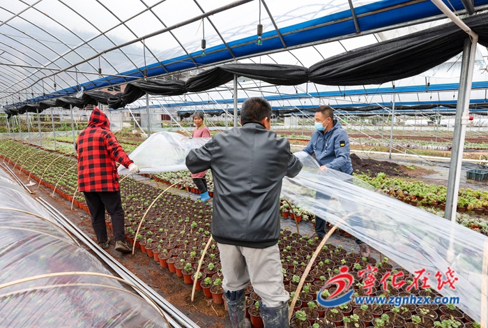 在謝坊村多肉種植基地,農技人員針對露天作物和大棚作物,因地制宜采取分類指導措施,通過裝蓋大棚保溫膜、農用地膜覆蓋保溫等方法,增強多肉的抗寒能力。