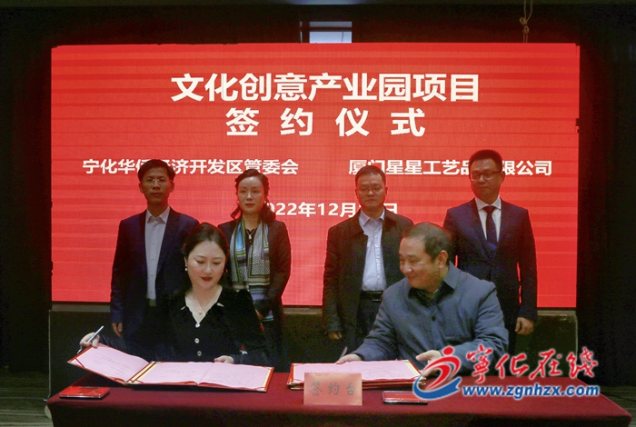 12月15日,寧化縣與廈門星星工藝品有限公司在客家國際舉行文化創意產業園項目簽約儀式。廈門星星工藝品有限公司業務副總黃珊瑚、行政副總劉子芳,縣委常委、副縣長張祖祿,副縣長饒浩出席簽約儀式。