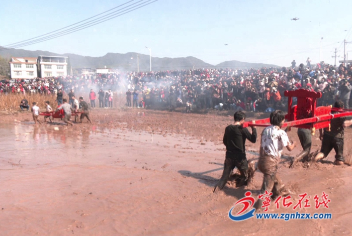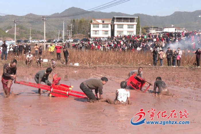 當日上午,陳塘村村民抬著“五谷神”開始繞村巡游,巡游所經之處,每家每戶村民都燃放鞭炮歡迎,鄉村處處洋溢著一派熱鬧、歡樂、祥和的節日氣氛。隨著11點到來,陳塘村獨具特色的“鬧春田”開始,四名漢子抬著“五谷神”沖入一口方形的水田,在水田中奔走嬉鬧。田岸上鞭炮齊鳴、煙霧迷蒙,水田中大家相互追逐,相互嬉鬧,個個成為泥人。
