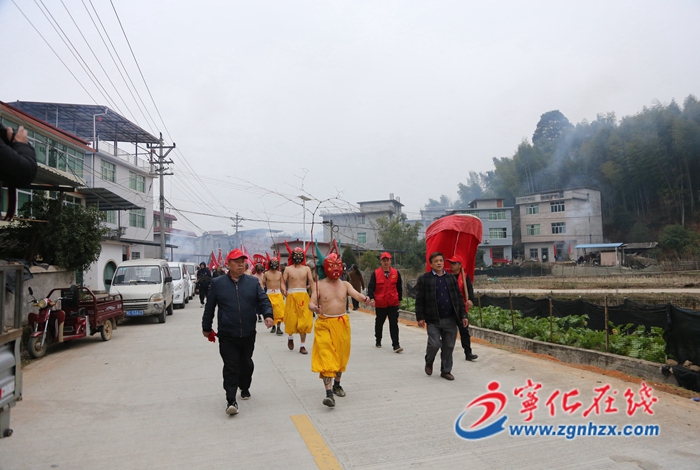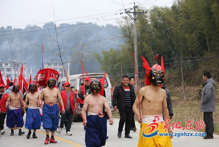 2月3日上午9時許,在一聲震耳的銃響后,“儺神”面具裝扮完成,七位儺神依次手舞足蹈地從吳氏祖堂大門跳出來,各手持一枝“祈福鞭”左右揮動,群眾們主動上前接受輕輕鞭拂,以示得到平安。隨后,游儺隊伍由牌子鑼鼓開道,七位“儺神”排成一字縱隊,眾多孩童組成隊伍手擎彩旗緊隨其后,開始沿著村子巡游,村民紛紛燃放鞭炮焰火,向儺神作揖祈福。